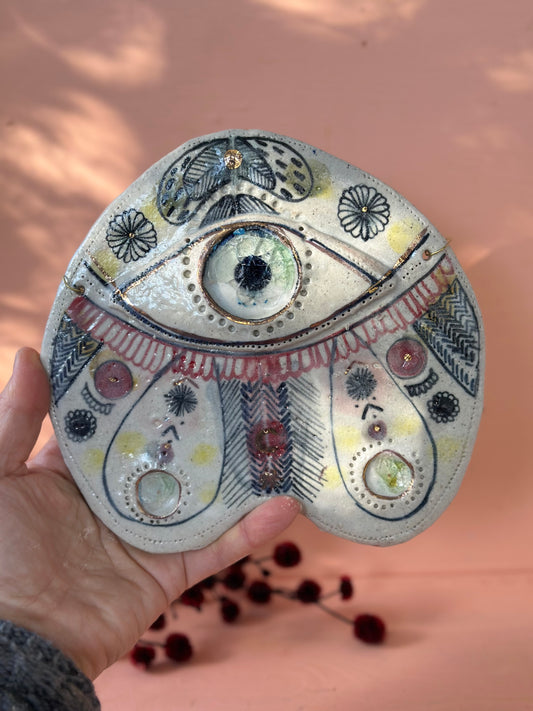 ‘Moth, protective eye’ porcelain wall piece, small gold lustre detail