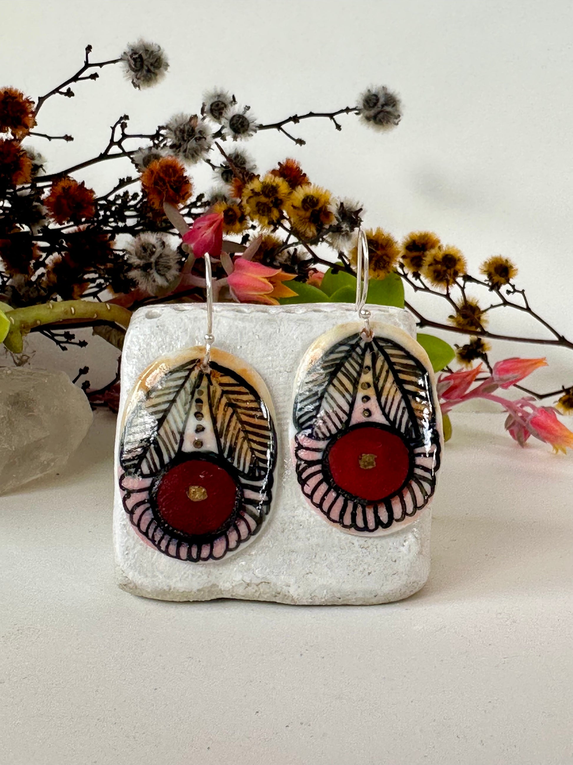 A pair of one of a kind hand painted porcelain earrings with gold lustre detail, and gold plated sterling silver hooks.