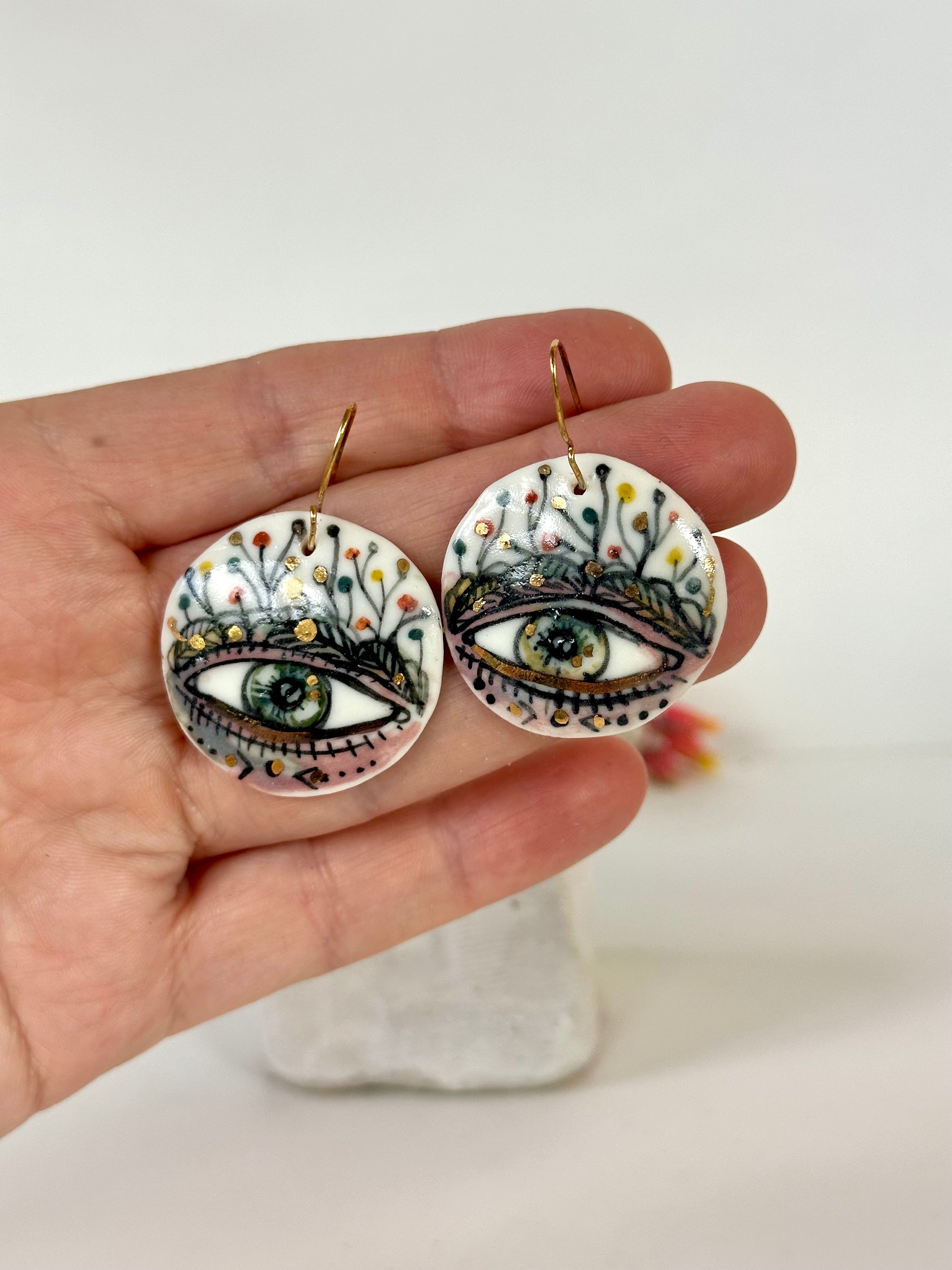 These fun earrings are individually painted in ‘protective eye’ design, and high fired.