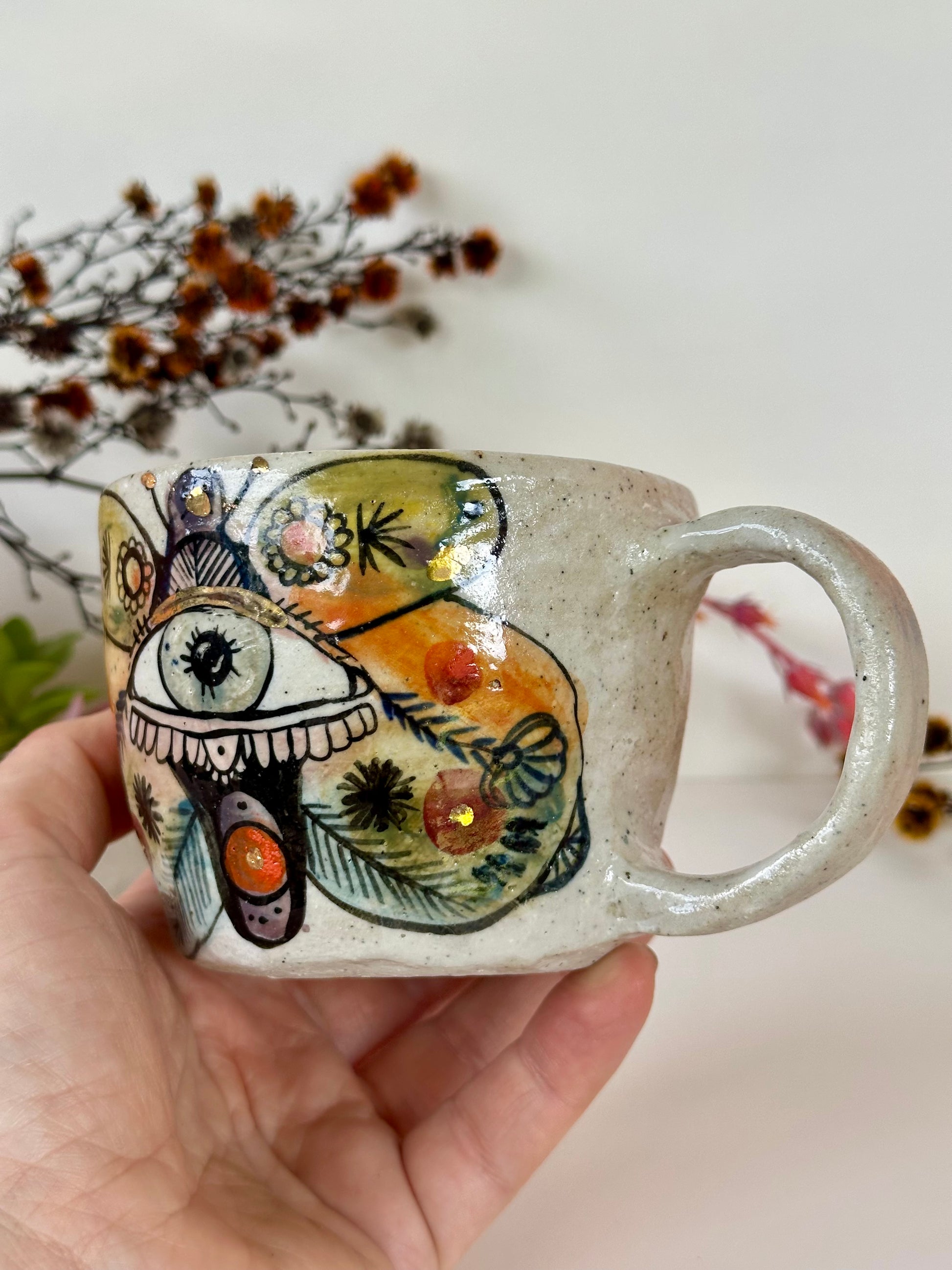 Hand made and hand painted cups with original artworks, hand painted by Australian artist Katherine Wheeler in her studio in Castlemaine Victoria.