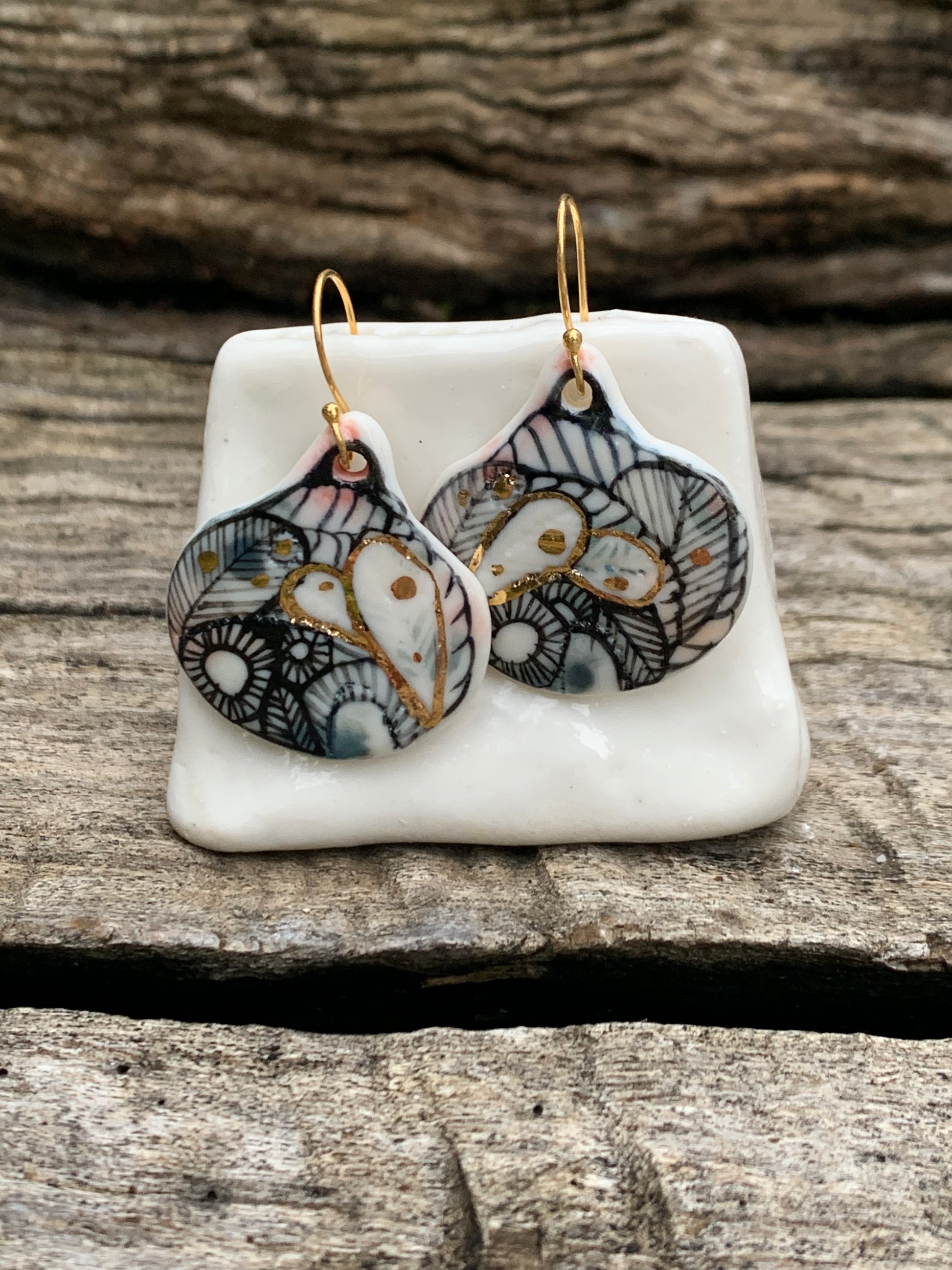 One of a kind porcelain hand crafted earrings with gold lustre detail. The patterns are inspired by textures and patterns observed while beach combing.