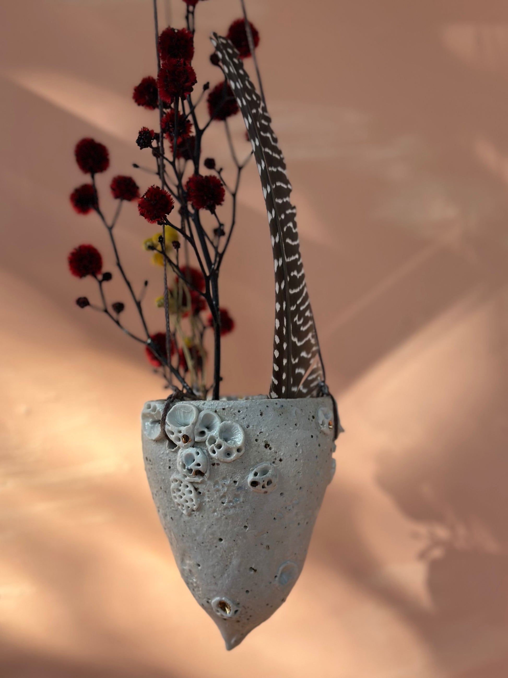 A one of a kind porcelain hanging vase, made by katherine in her home studio in castlemaine, central Vic. These small pods hang from a strong waxed thread.